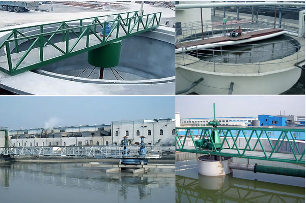 ZCG型中心传动刮泥机采用中心传动、悬挂式,污水从工作桥下进水管流入导流筒扩散后,均匀的向周边呈辐射状流出,呈悬浮状的污泥经沉淀后沉积于池底,驱动装置带动中心立轴旋转,并带动刮臂及刮泥板转动,将污泥从池周刮向中心集泥槽后,靠池内静水压由排泥管排出池外,水面上的浮渣通过旋转撇渣装置撇向池边,再由刮渣耙刮进排渣斗内排出池外;而上清液则通过三角形出水堰板溢入出水槽内排出。