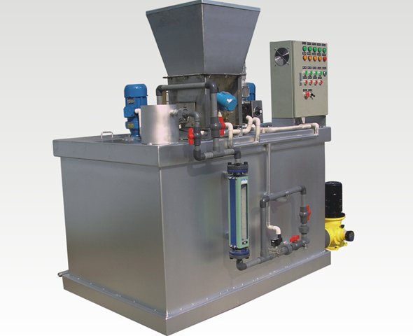 干粉加药装置是一个智能化、全自动、连续式一体化的絮凝剂溶配及投药装置,配制溶液范围为0-4000升/时,浓度为0.1%-0.5%。